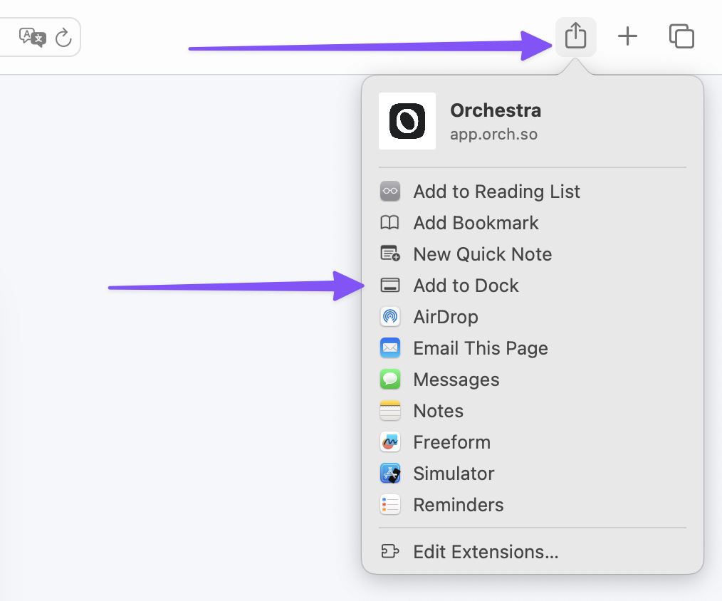 Open [app.orch.so](https://app.orch.so) in Safari (Sonoma and later versions), click the Share icon, then select *Add to Dock*.